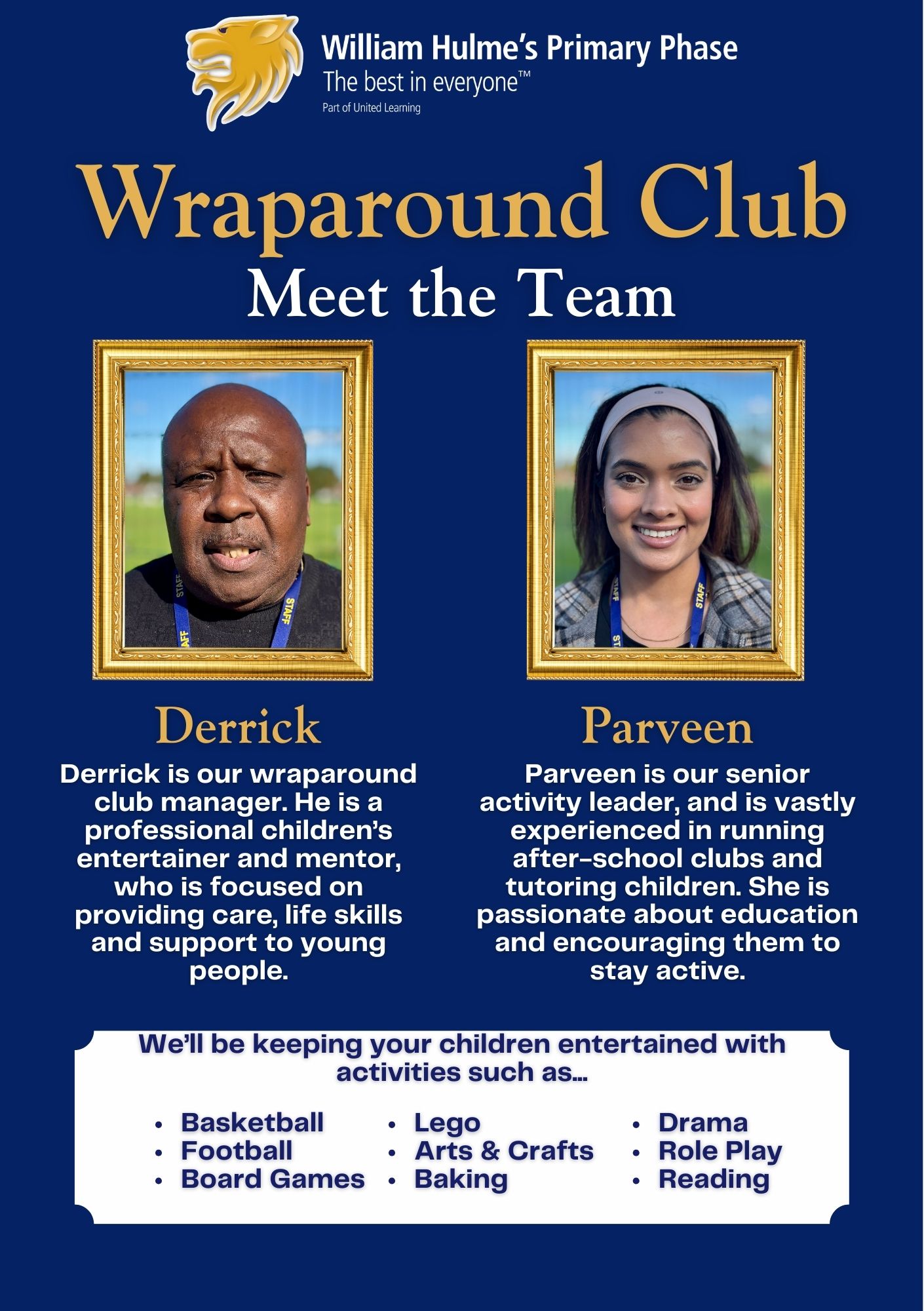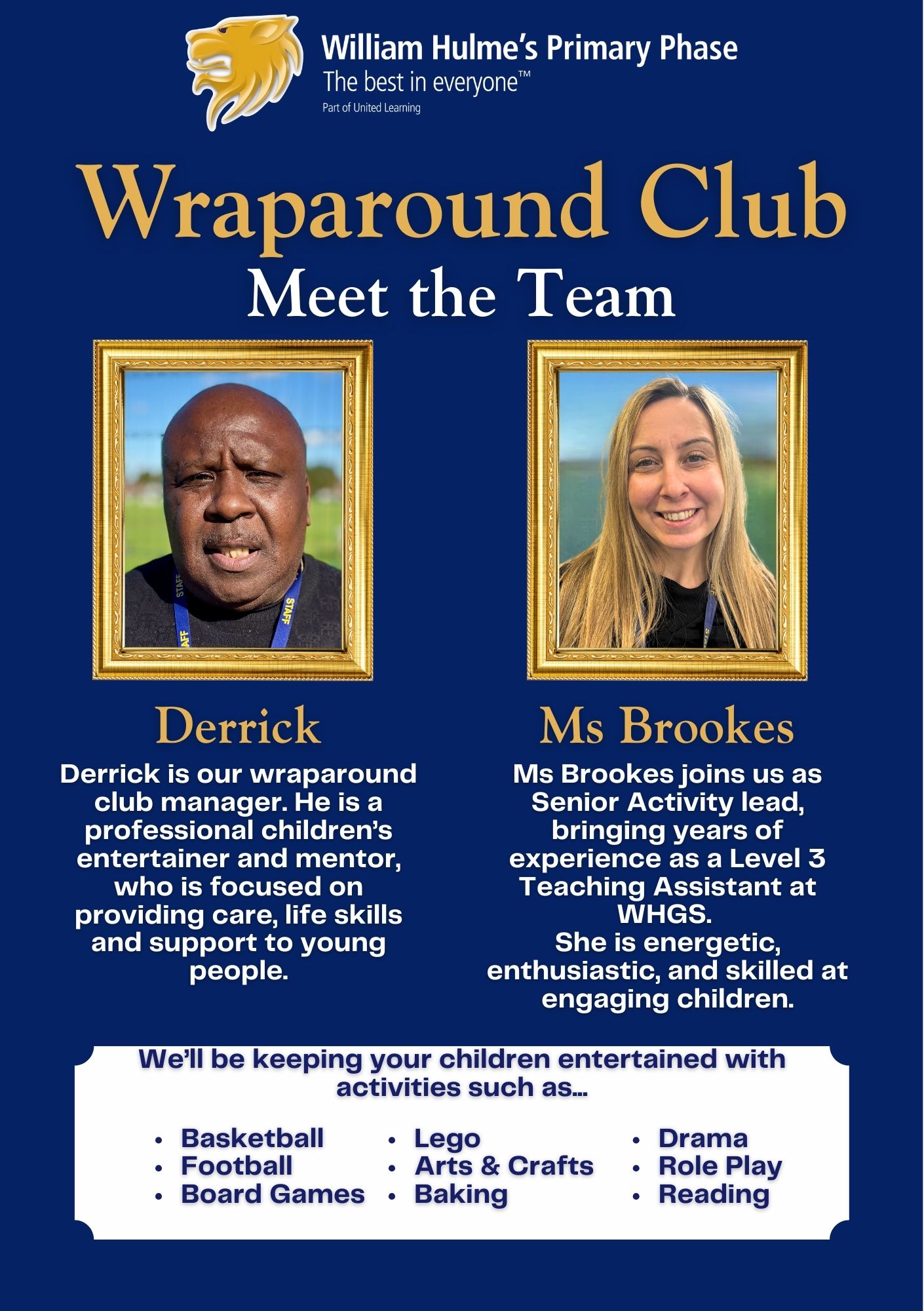 We understand that you need childcare that is high quality, reliable and safe. Our staff team are of the same high standard as our existing school staff, ensuring the schools standards and our school values of Respect, Ambition and Compassion will be maintained. You can rely on the club to be open every day of the school year, and to have the availability to support your childcare needs. Children will be expertly looked after from the moment they arrive in club, to the moment they leave.